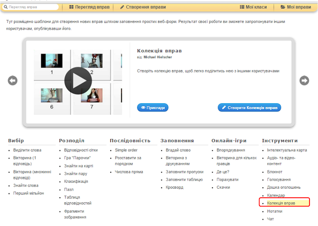 У кожній групі доступно кілька шаблонів вправ, опис та зразки яких можна попередньо переглядати перед тим, як створити власний навчальний ресурс.